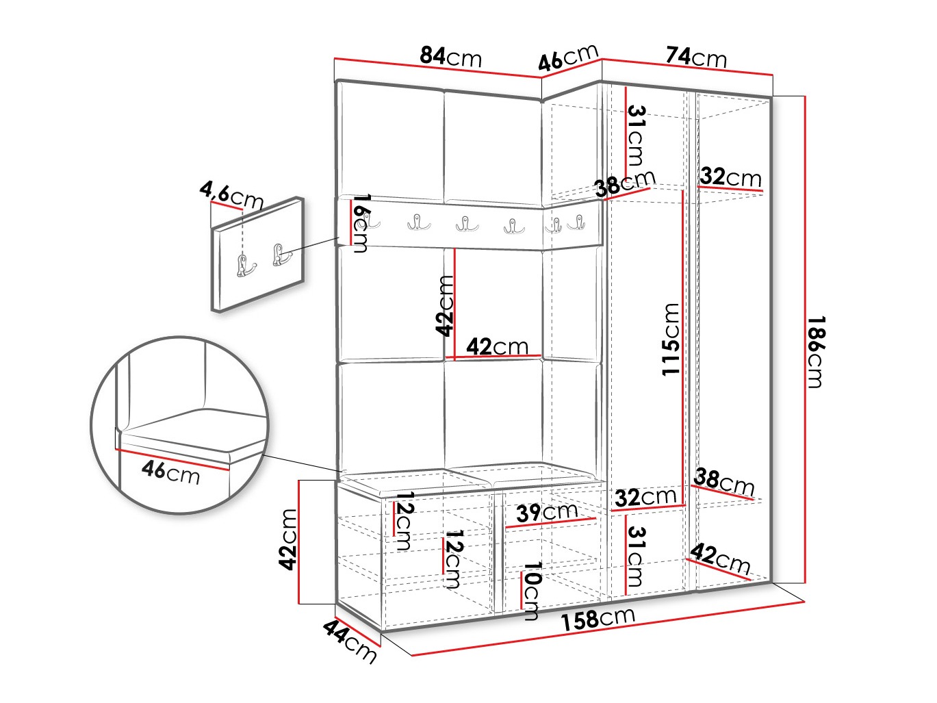 186 x 74 x 46 cm