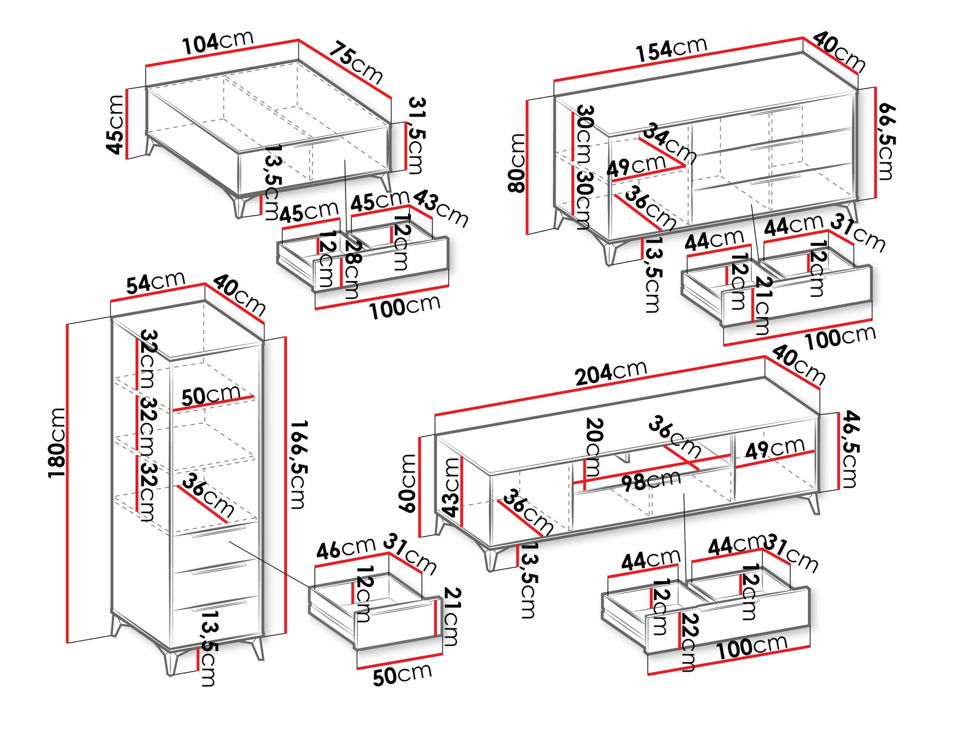 Seinäkiinnitystiedot. Seinään kiinnitettävissä tai ripustettavissa huonekaluissa ei ole mukana kiinnitysruuveja, joten ne on hankittava erikseen. Ruuvit ja poraussyvyys tulee valita seinän mukaan. Valitse asennustyökalut huonekalujen painon ja seinän materiaalin mukaan, kuten kipsilevy, tiili tai puu. Kiinnityksen laadun ja turvallisuuden takaamiseksi tulee käyttää seinätyypille suunniteltuja ruuveja.